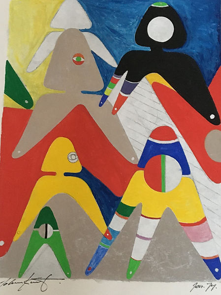 The Attic Series is Johannes Kunst’s use of simplified, biomorphic figures to represent both the oppressive confinement of hiding and the vivid, imaginative world he retreated into. Instead of realistic scenes, the paintings depict these "expressively recaptured memories" through a unique visual language.